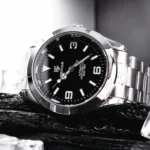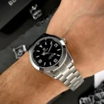 Водонепроницаемость до 50 метров позволяет носить его даже во время занятий водными видами спорта, не беспокоясь о повреждениях. Минеральное стекло защищает циферблат, декорированный арабскими цифрами и индексами, от царапин и загрязнений.
