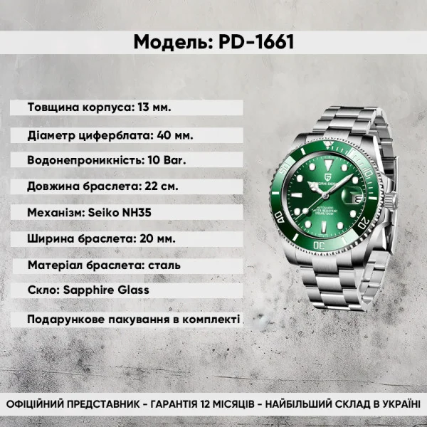 Pagani Design PD-1661 Silver-Green — чоловічий годинник із автопідзаводом у стильному оформленні