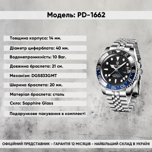 Годинник Pagani Design PD-1662 в сріблястому, чорному та синьому кольорах є ідеальним вибором для сучасного чоловіка. Його корпус виготовлений з нержавіючої сталі, а сапфірове скло забезпечує високу стійкість до подряпин. Механічний з автопідзаводом механізм підкреслює надійність та точність.